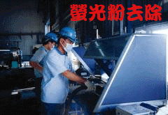 監視器之處理程序為:拆解→螢光粉去除→粉碎、分選  | 監視器經拆解程序後,將被分解為塑膠、映像管及IC板等電子廢料。 | 映像管經去除(吸出)其中螢光粉後,將分離出螢光粉及映像管玻璃。 |  |  | 映像管玻璃、IC板等電子廢料經進一步粉碎、分選後,將分離出映像管玻璃粉、玻璃纖維樹脂粉、銅、鐵、錫、鉛等金屬 |